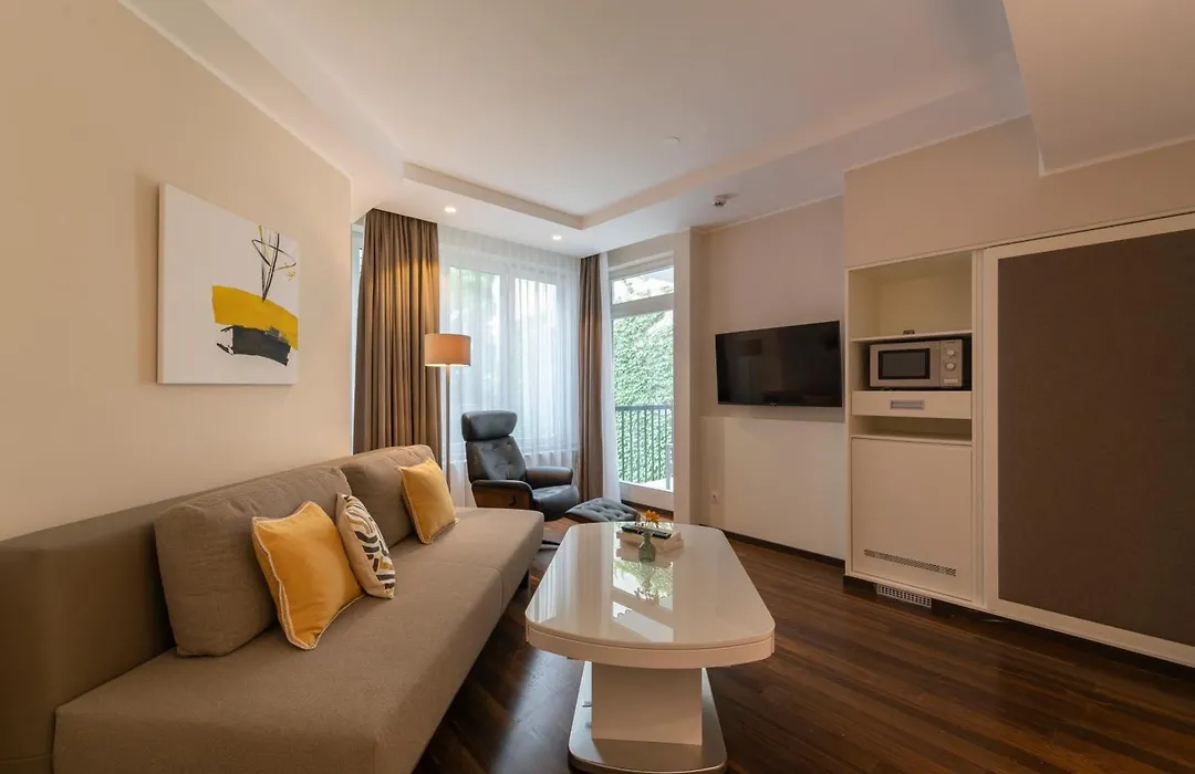 Помимо таких удобств, как персональный сейф и электронный ключ, в апартаментах есть диван. Кроме того, комфортный отдых помогут обеспечить система климат-контроля. Апартаменты с телевидением и многоканальным телевидением позволяют гостям в полной мере насладиться отдыхом. В ванной комнате доступен отдельный туалет и душ, а также фен и шапочка для душа.